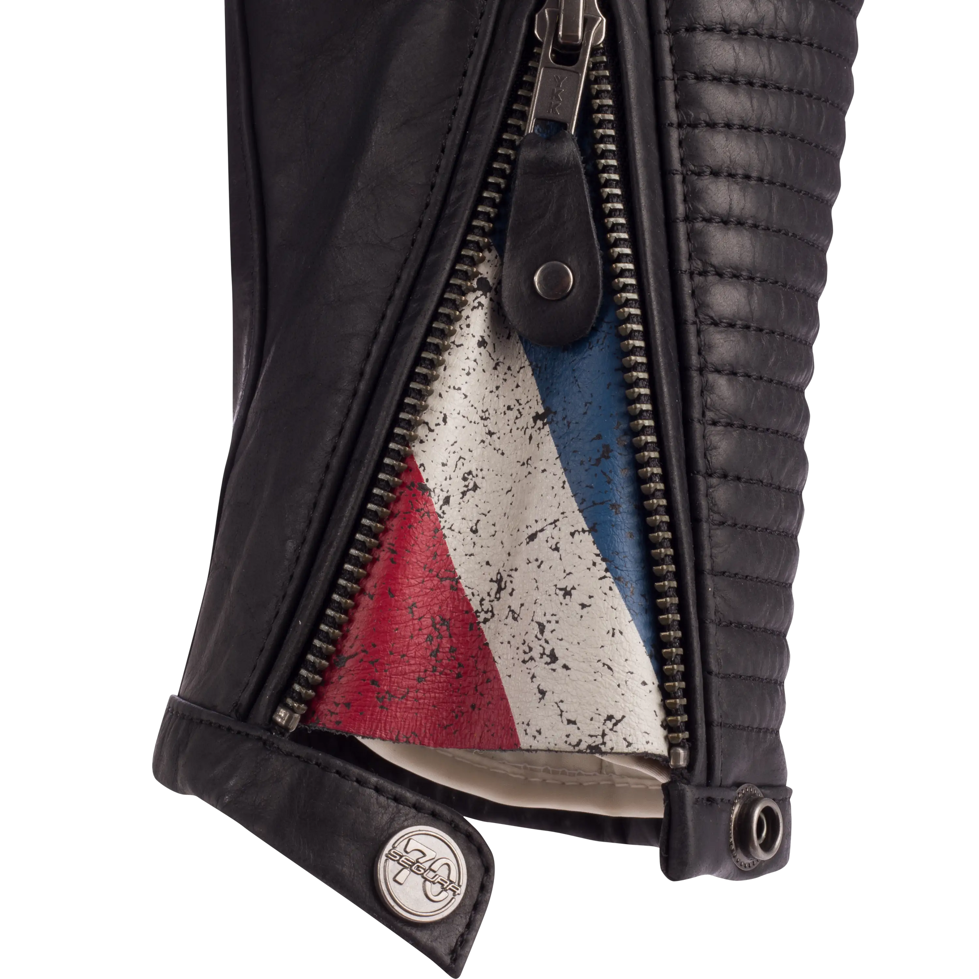 The jacket's retro aesthetic is accentuated by the carefully crafted embossing on the shoulders, arms, and ribs. A unique patch is featured on the left chest, which changes depending on the color chosen, allowing each rider to express their personality and individual style.