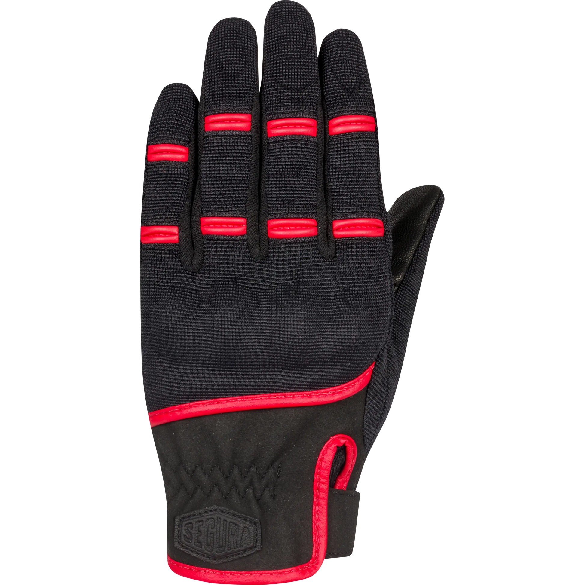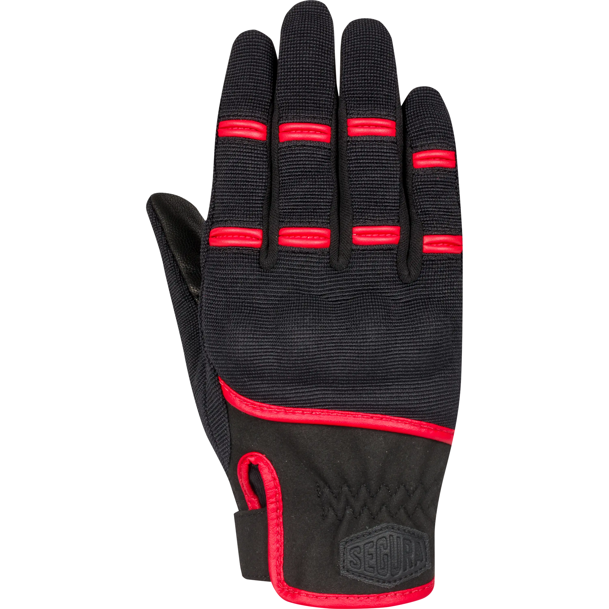 Les gants de moto LADY PALMER de SEGURA pour femmes, fabriqués avec un mélange résistant de Spandex Amara et de cuir de chèvre, offrent un style audacieux en noir et noir-rouge.
